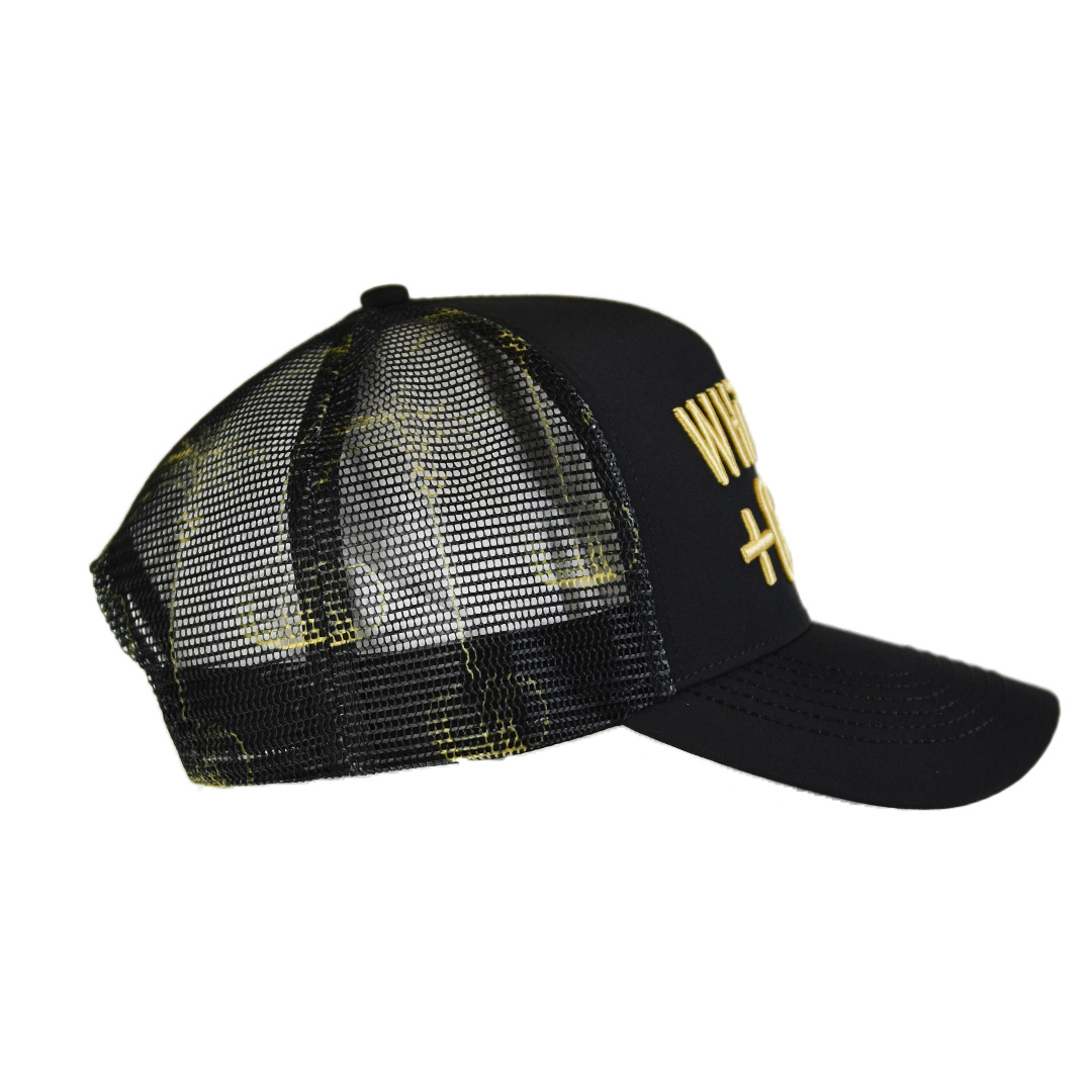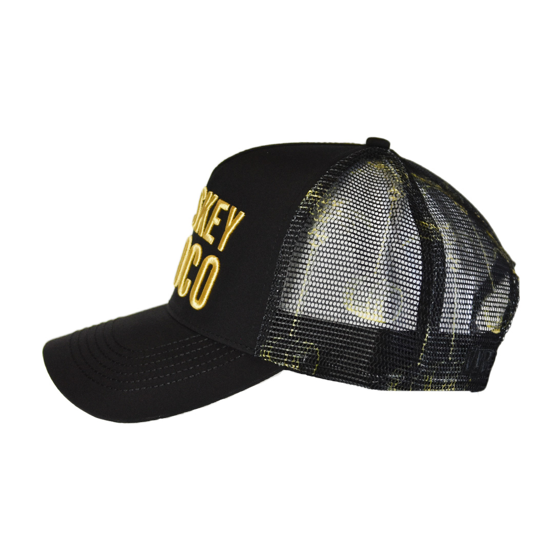 Our trucker hat is the perfect size, shape and construction, featuring our WHiSKEY + COCO branding embroidered on the front in gold. The custom printed mesh features our signature Palm & Barrel icon in matching gold, with a classic black snapback closure for that perfect fit. The details continue under the bill with our signature WhiCo palm and barrel repeating icon pattern in gold on the matching black panel. Our luxurious, extra fine quality microfiber fabric combined with premium matching color mesh provides all day comfort and style, anytime, anywhere! One of the best looking trucker hats in the market!